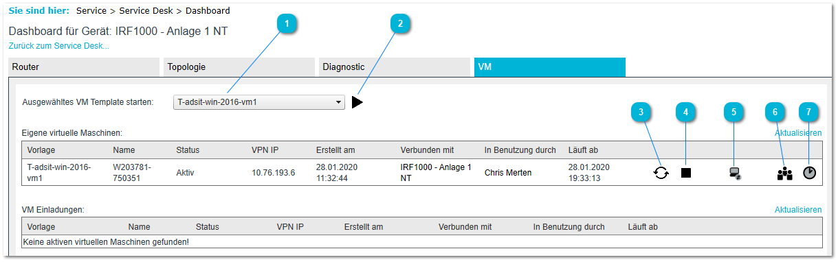 Über diese Schaltfläche können Sie andere Benutzer einladen, sich auf die betroffene VM einzuloggen. Hierbei ist zu beachten, dass RDP-Verbindungen nur exklusiv für genau einen Benutzer möglich sind: Sobald sich der eingeladene Benutzer an der VM anmeldet, verlieren Sie die Verbindung.