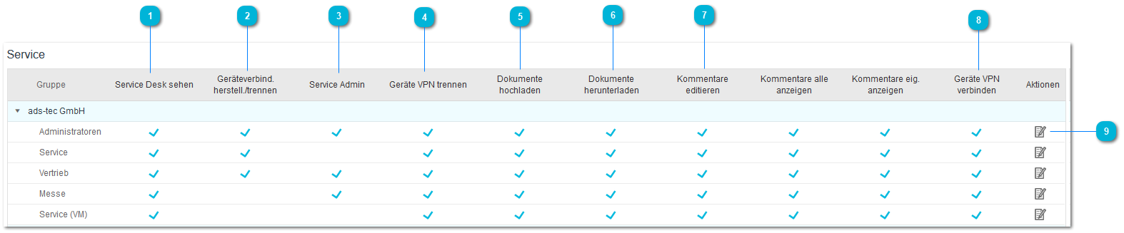 Durch Klicken auf das Bearbeiten-Symbol können Sie die Rechte für die jeweilige Gruppe bearbeiten.
