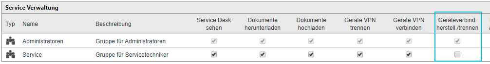 Sollen die Servicetechniker zwar über VM auf Rechner zugreifen, aber keine Direktverbindung zwischen ihrem Rechner und den zu wartenden Rechnern aufbauen können, muss der Administrator der entsprechenden Benutzergruppe das Recht "Geräteverbindungen herstellen/trennen" entziehen: