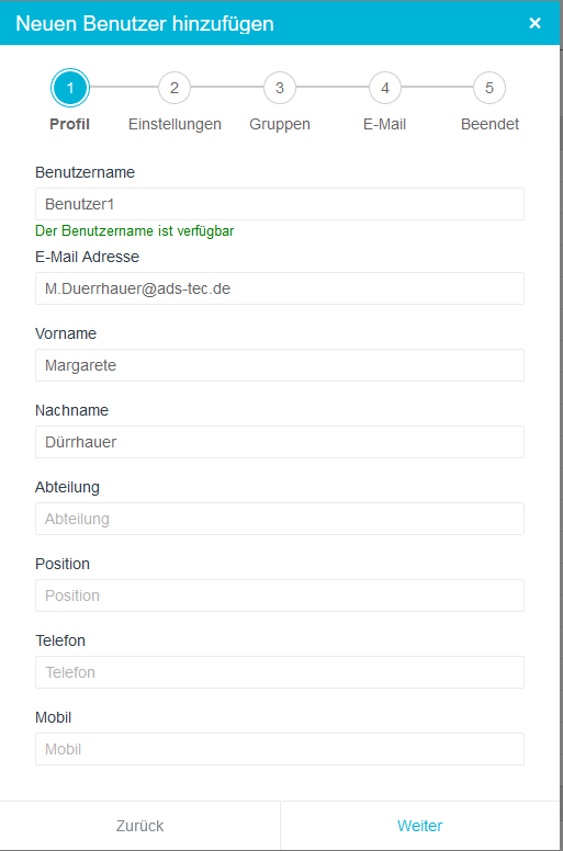 Schritt 2: Geben Sie die Daten des neuen Benutzers ein. Bei "E-Mail Adresse" tragen Sie die Adresse des neuen Benutzers ein.