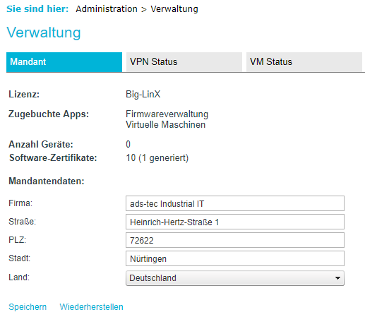Tipp: Die bei der Anmeldung zu Big-LinX gemachten Angaben zu Ihrem Mandanten kann der 'Superadmin' bei Bedarf auf der Seite Administration > Verwaltung > Mandant bearbeiten (erweiterte Rechte erforderlich).