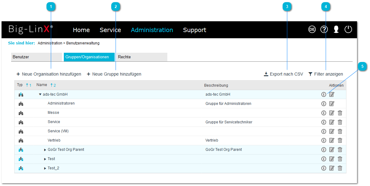 In der Benutzerverwaltung im Reiter "Gruppen/Organisationen" können Sie neue Organisationen und neue Gruppen anlegen, verwalten und löschen (erweiterte Rechte erforderlich). Diese Funktion bietet Ihnen die Möglichkeit verschiedenen Organisationen/Gruppen verschiedene Features/Rechte einzuräumen.