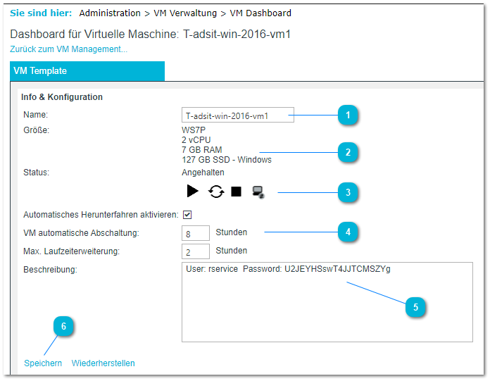 Nutzen Sie grundsätzlich diese Schaltfläche, um eine aktive VM zu beenden. Wenn Sie die VM nur mit den Mitteln des Betriebssystems herunterfahren, bleiben der Speicherplatz und die Rechenleistung reserviert und es entstehen weiterhin Kosten.
